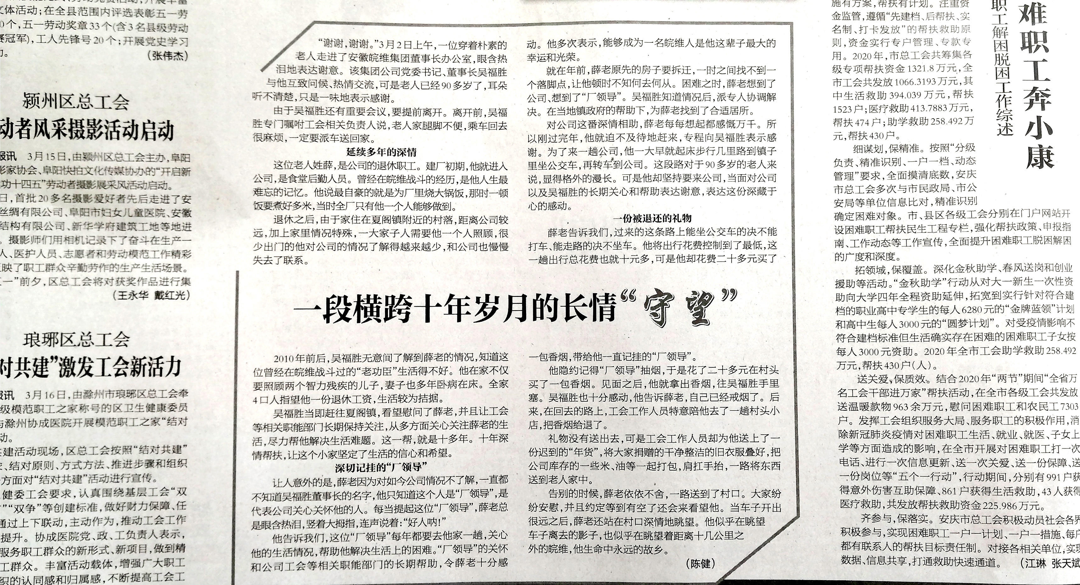 3月18日,安徽工人日报编辑专程打电话咨询相关情况,对公司情系职工的暖心之举表示感动和敬意,并希望将这则新闻故事刊载在安徽工人日报,广泛宣传。3月19日,安徽工人日报于重要版面二版,以《一段横跨十年岁月的长情“守望”》为题专题刊载这则新闻故事。
