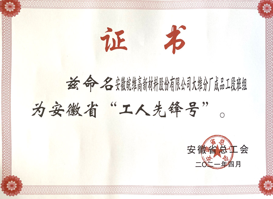大维分厂成品工段班组负责公司高强高模PVA纤维产品的生产,一直恪守“外贸无小事”原则,对各个生产环节严格管理,严把PVA纤维出口质量关,多年来没有发生一起质量投诉事件和安全生产事故,实现了社会效益和经济效益的双丰收。去年该班组代表公司参加安徽省“江汽杯”现场管理创新大赛,获得质量信得过班组成果一等奖,由安徽省质量品牌促进会推荐申报至安徽省总工会,在众多优秀劳动竞赛先进集体中“脱颖而出”,被评为本年度“安徽省工人先锋号”。